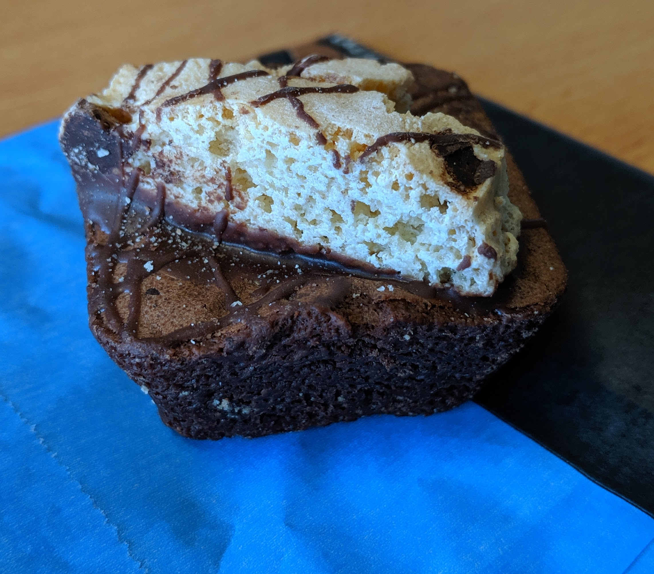 Texture: There’s an irritating gradient here: in the middle it’s pretty close to perfect brownie, then it gets worse towards the outside until the edges are an awful ghastly dry crumbly mess. That does mean that most of the brownie is good, but also makes it hard to take a bite that doesn’t start with “ugh”. The best way to do this is to take a bite of a bit with the biscotti on top, and despite my earlier misgivings the biscotti-brownie combination is actually pretty fun – slightly hard to eat, but it works! 6/10