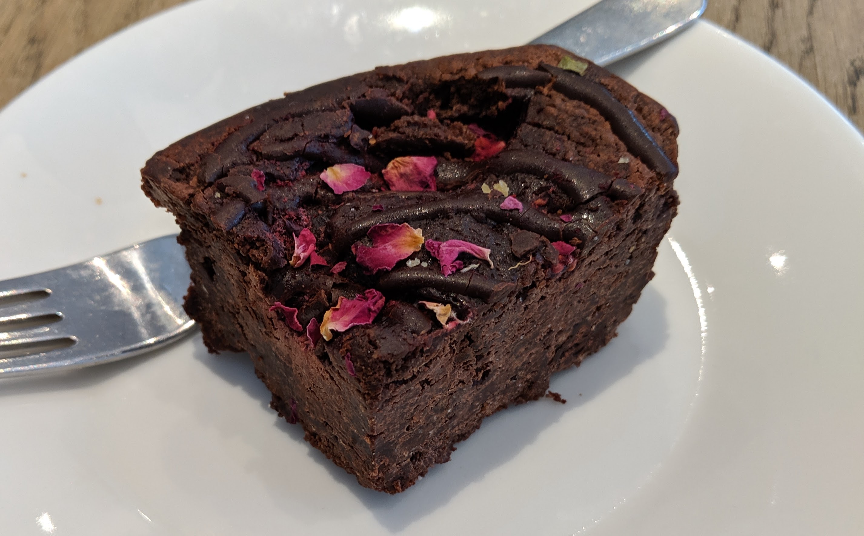 Solid yes if you’re also excited about eating rose flowers and sad you don’t get to do it enough. Otherwise I’m a little sorry to say that if you are in South River Coffee, or passing by, I think they have other cakes which are better suited to the fact that their cakes sit in a fridge cabinet all day. Things like flapjack or tiffin are designed to be stored like that: brownies, not so much, and although I’ve been a bit generous I feel that this brownie is designed to be a fridge cake first and a brownie second.