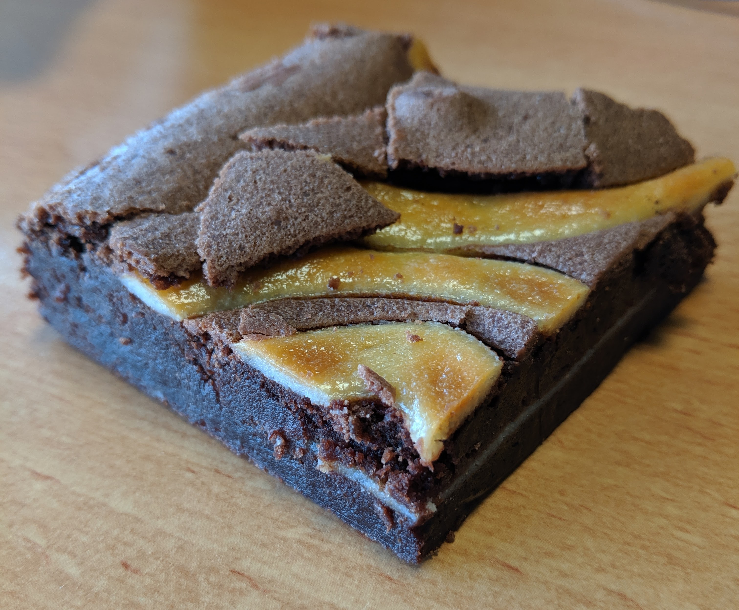 Cheesecake brownies are not exactly uncommon, but I imagine they’re quite hard to get perfect. If you decide to bake the cheesecake topping, then you need to time your baking carefully to avoid overdoing it. If you go for a no-bake cheesecake approach and cover the brownie when it’s cooling in the fridge (I’ve also seen this done) then I could see all sorts of difficult things happening to the consistency of both layers at the interface. If you decide to go for a cheesecake marbling instead, with some cheesecake between a couple of layers of brownie, then you really risk some interface problems (based on the cross-section of this brownie, they seem to have tried this but not ended up with very much cheesecake at all in the middle).