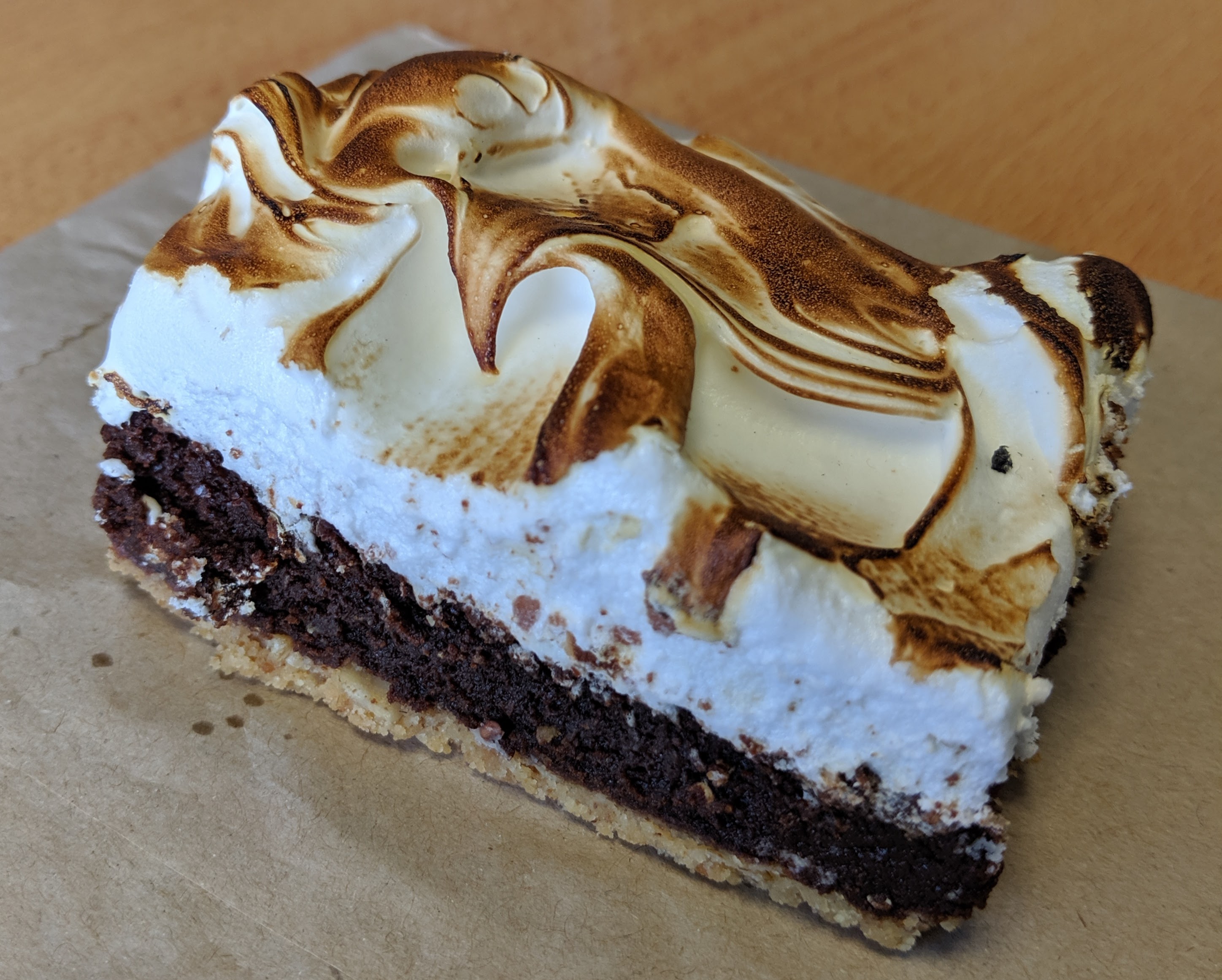 I poked the top a few times experimentally before eating it. If this is a s’more, it should be marshmallow, right? I… think it’s actually meringue? I can’t decide if I reckon this is an improvement or not. Marshmallow is not exactly my favorite thing. The texture’s too gummy for my tastes and I’m not that into things that taste of nothing more complicated than “sweet”. Maybe meringue is better? Let’s find out what I think of the whole thing.