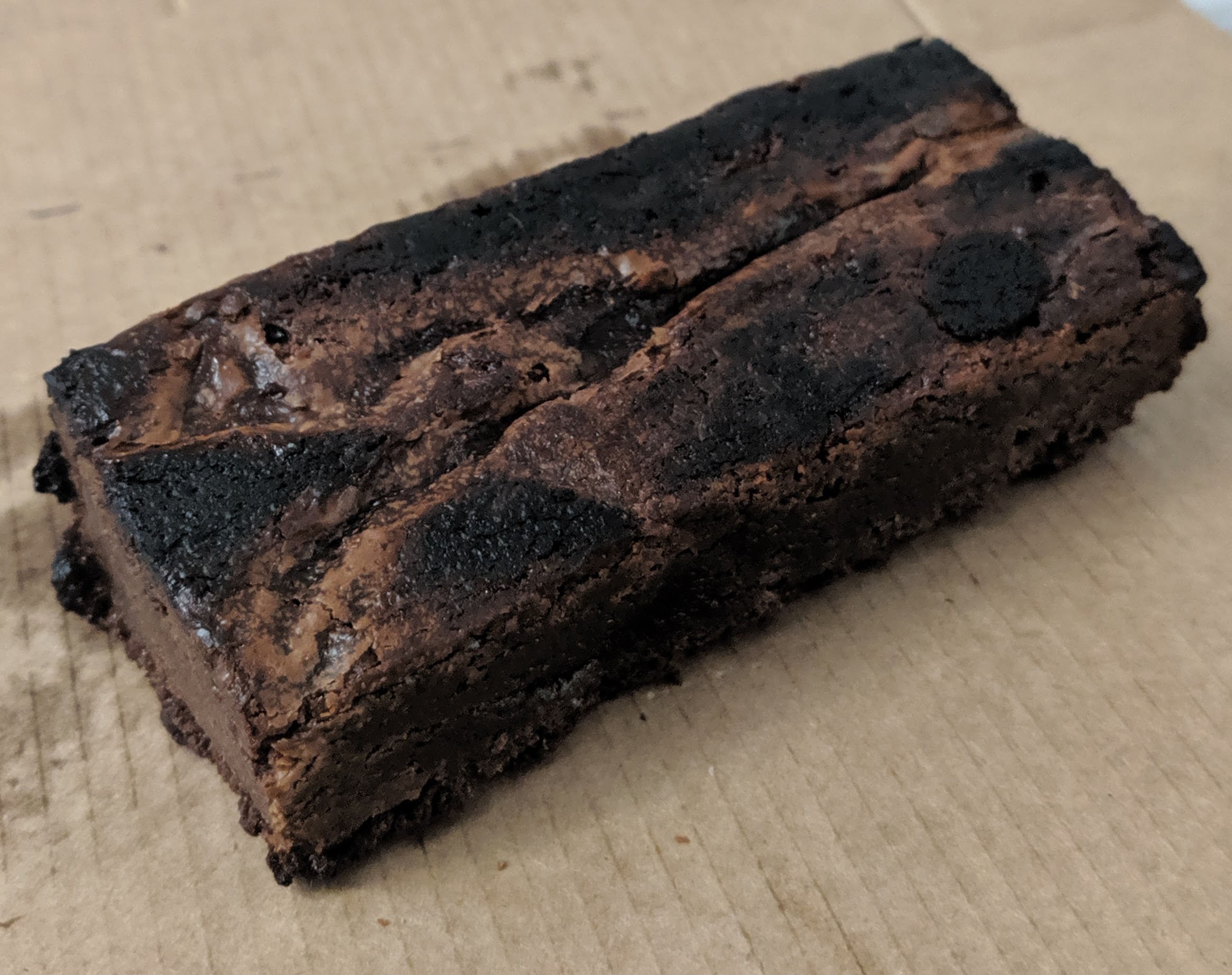 Presentation: It’s not presented well at all, though I’m not sure what you could really do once you’d chargrilled the brownie like this. It’s sat on its own in a cardboard box. I’m seriously considering making it the first actual brownie to not go into the rotation list for the site header image. 0/5