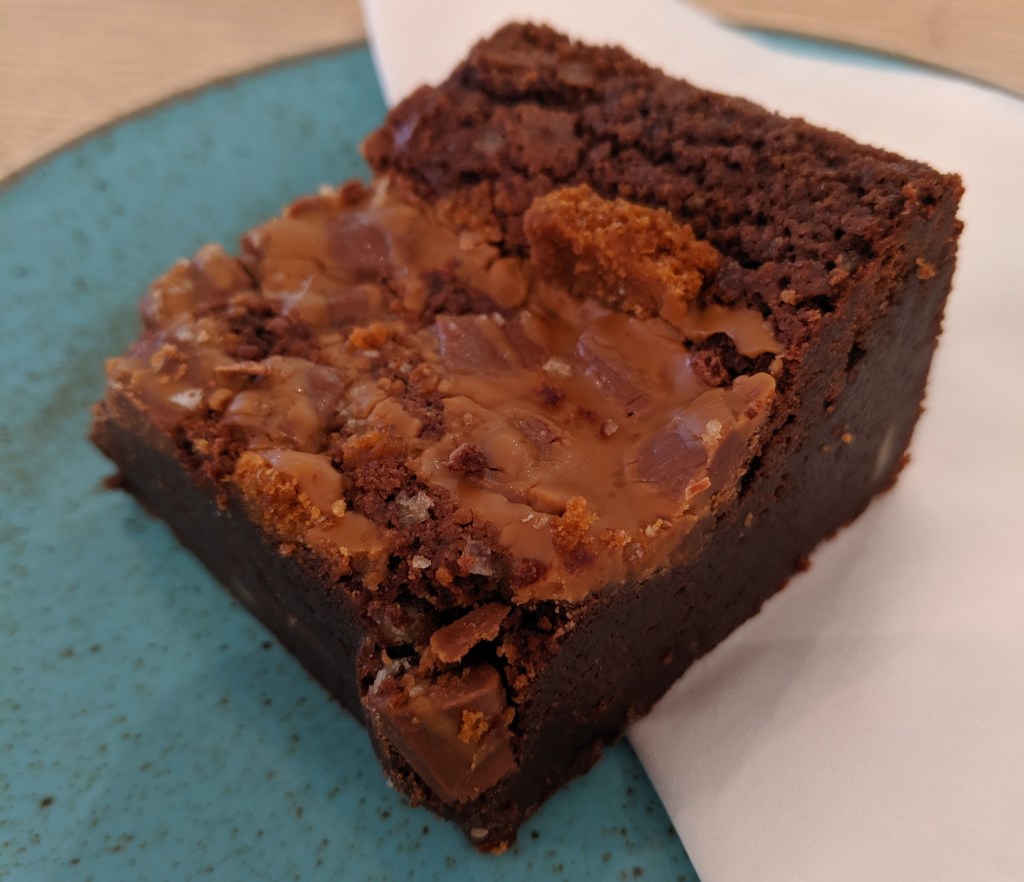 What about the place itself, the Apple Blue? It’s another Balham brownie supplier, just next to the railway bridge. The interior was spartan but comfortable, the staff friendly, and the coffee tasty. The website (I’d recommend taking a look) has quite a sweet story making it out to be a proper community pillar, and there’s a huge number of other cakes, pastries, etc available, and it definitely seems like a nice place where I could spend a lot of time with coffee and cake. But what about the brownie, the reason I came in here in the first place? Let’s find out!