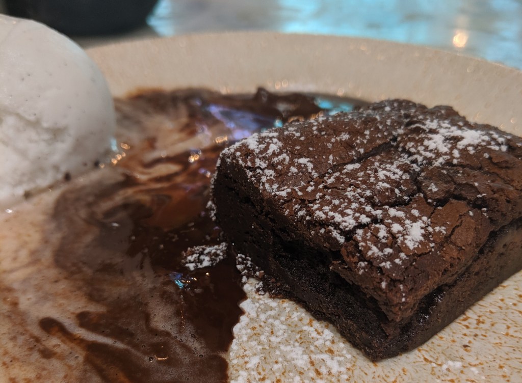 Anyhoo, flying out to Budapest! I’m in Gatwick (at least I was when I ate this brownie). I’ve flown from Gatwick a lot this year, but I guess I hadn’t spotted this place before? It claims to ‘bring a taste of California’, which makes sense as it’s named for a region of California. In practice, ‘a taste of California’ seems to mean ‘we serve all sorts, eat whatever you like’. I was tempted by the all-day fried English breakfast, but instead went for an actually pretty good pizza, and then of course I had to have the brownie. The menu suggested nothing particularly fancy or novel about it – it comes with dark chocolate sauce and vanilla ice-cream, like the vast majority of standard restaurant brownies – but let’s dig in and see what we’ve got.