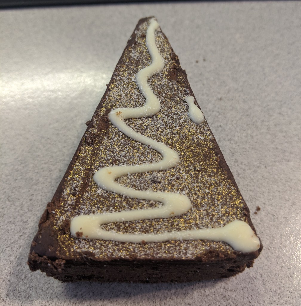 Presentation: I like the shape of it a lot actually, including the way it’s just a pretty straightforward triangle but the irregular icing gets across the concept of a christmas tree. The glitter is maybe overkill. 4/5