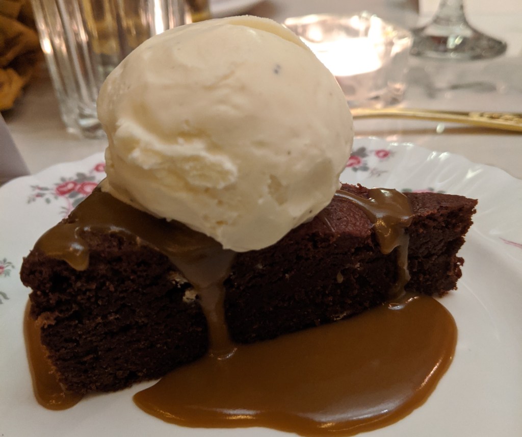 Here’s the salient facts about this brownie: it was chocolate; it came with vanilla ice-cream and caramel sauce, and some lumps inside it that I think were some sort of nut but no-one I spoke to at the party who’d had the brownie could really identify them; I had a nice dinner and drank too much afterwards. I made some notes about a brownie which I have now basically forgotten and I’m gonna try to hash out a post about this brownie anyway.